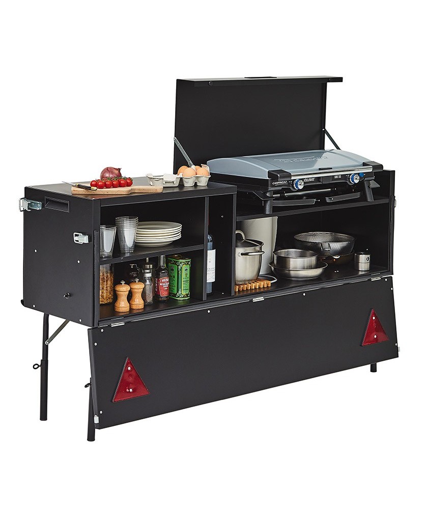 LES PLUS : Bloc cuisine extérieur avec évier, 3 feux ou 2 feux grill, étagères intérieures